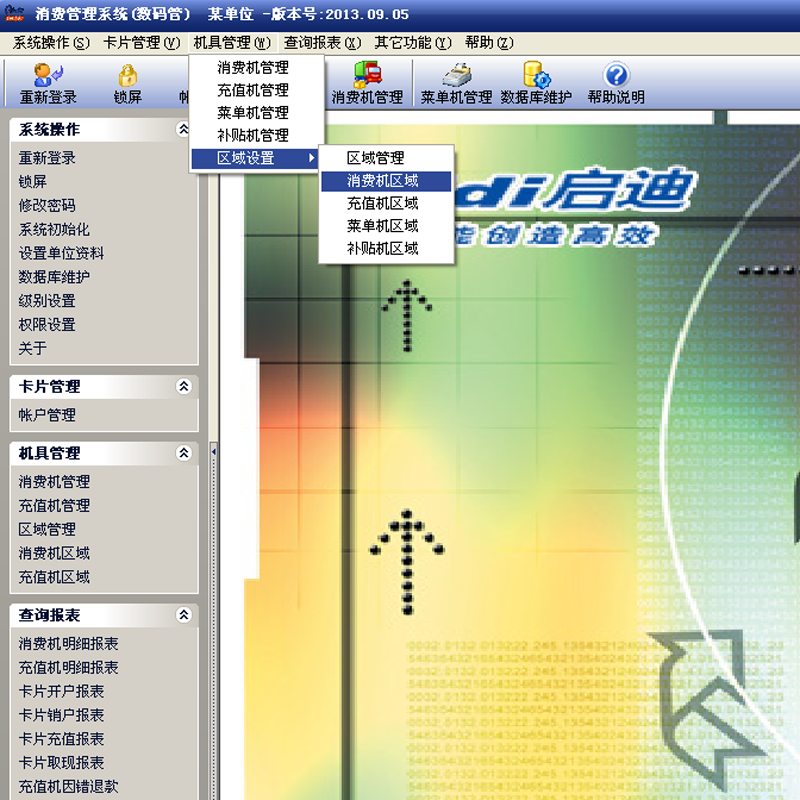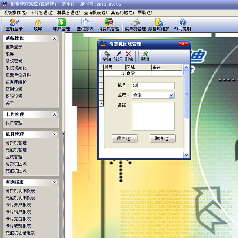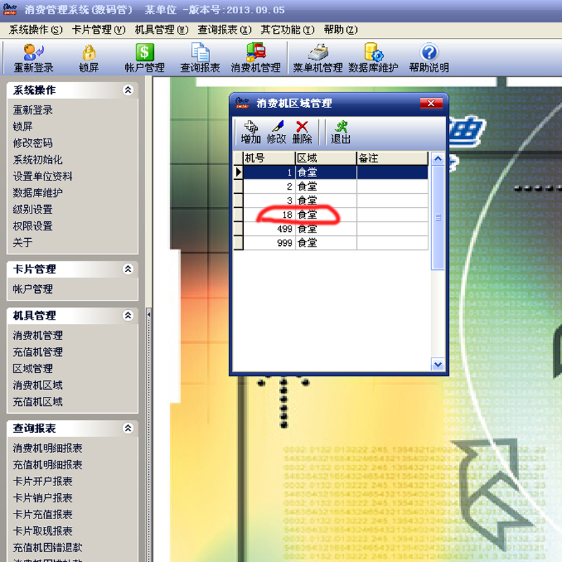 ”機(jī)具管理”-----“區(qū)域設(shè)置“-----”消費(fèi)機(jī)區(qū)域“------”增加“------機(jī)號(hào)填寫(xiě)”18“------點(diǎn)擊”保存“------在消費(fèi)機(jī)管理區(qū)域里會(huì)看到新增的18號(hào)機(jī)。